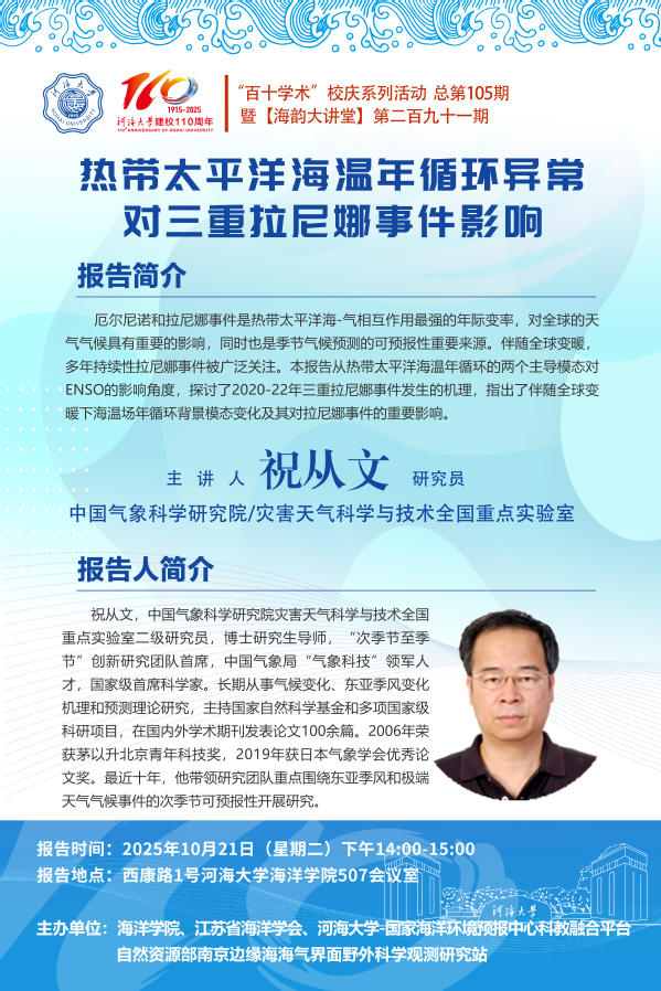 “百十学术”系列活动第105期——祝从文研究员:热带太平洋海温年循环异常对三重拉尼娜事件影响