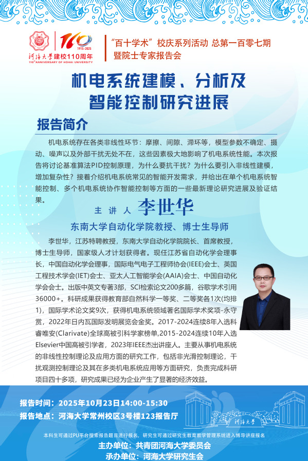 “百十学术”系列活动第107期——李世华教授:机电系统建模、分析及智能控制研究进展