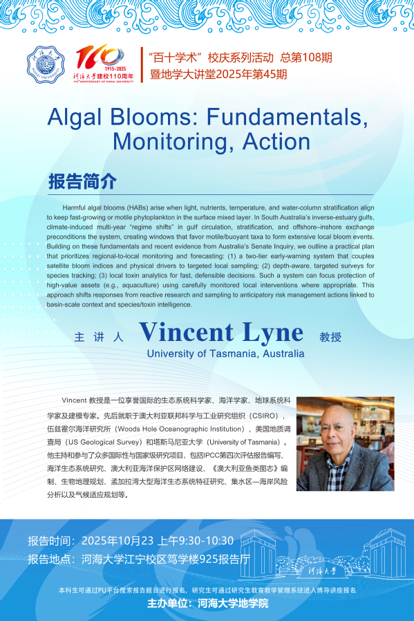 “百十学术”系列活动第108期——Prof.Vincent Lyne:Algal Blooms: Fundamentals, Monitoring, Action