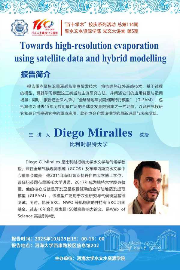 “百十学术”系列活动第114期——Prof. Diego Miralles:Towards high-resolution evaporation using satellite data and hybrid modelling