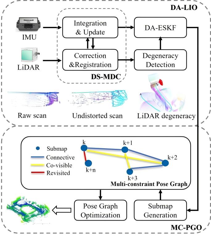 近期,河海大学地球科学与工程学院何秀凤教授课题组及其合作者在《ISPRS Journal of Photogrammetry and Remote Sensing》上发表了题为“DALI-SLAM: Degeneracy-Aware LiDAR-inertial SLAM with novel distortion correction and accurate multi-constraint pose graph optimization”的研究论文。