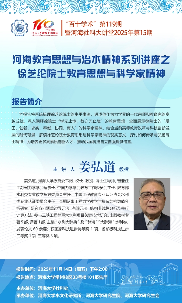 “百十学术”系列活动第119期——姜弘道教授:河海教育思想与治水精神系列讲座之——徐芝纶院士教育思想与科学家精神