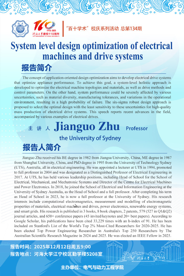 “百十学术”系列活动第134期——Prof.Jianguo Zhu:System level design optimization of electrical machines and drive systems