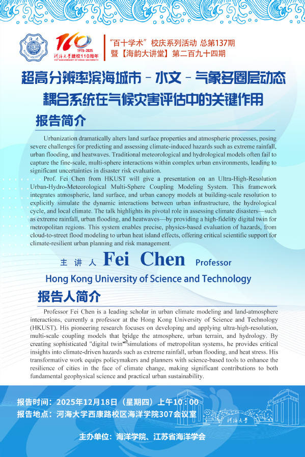 “百十学术”系列活动第137期——Fei Chen教授:超高分辨率滨海城市–水文–气象多圈层动态耦合系统在气候灾害评估中的关键作用