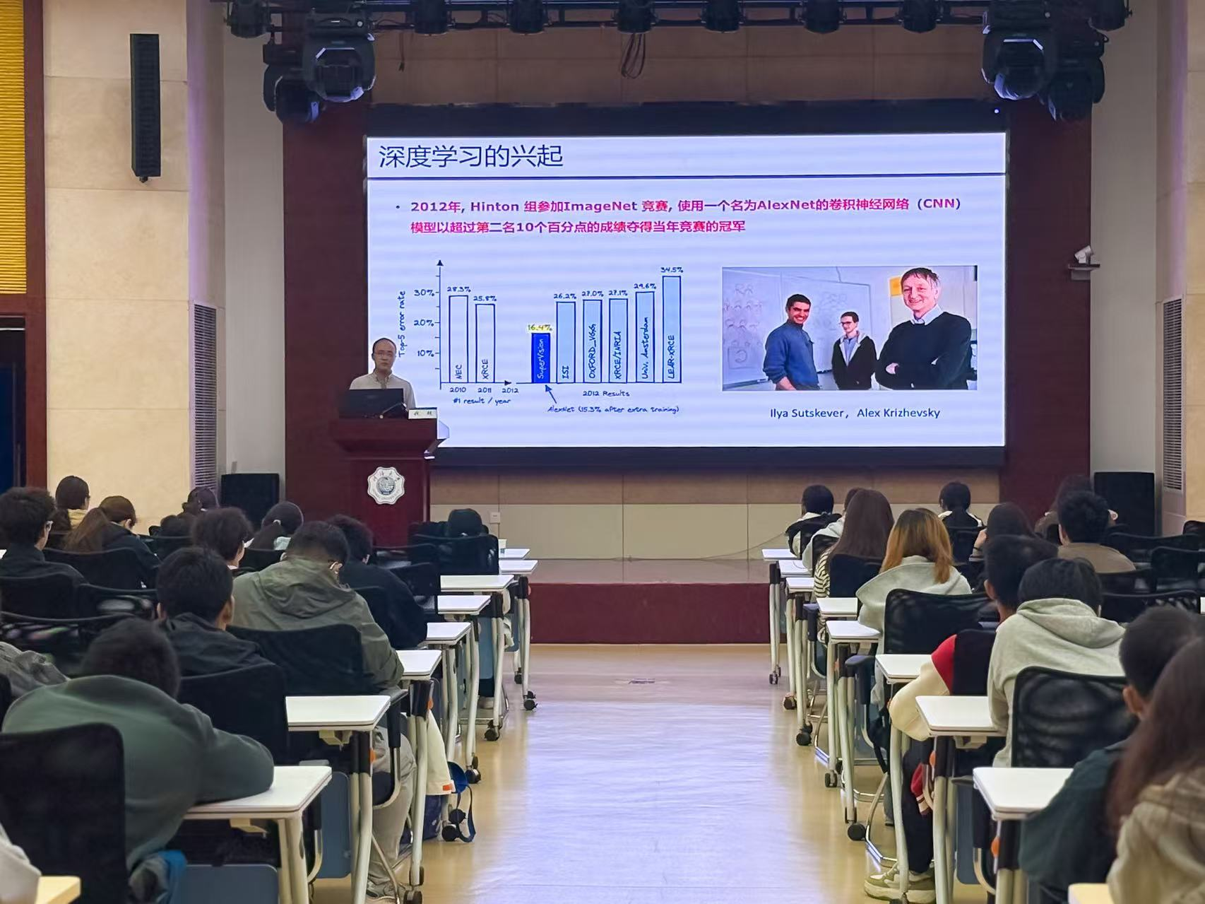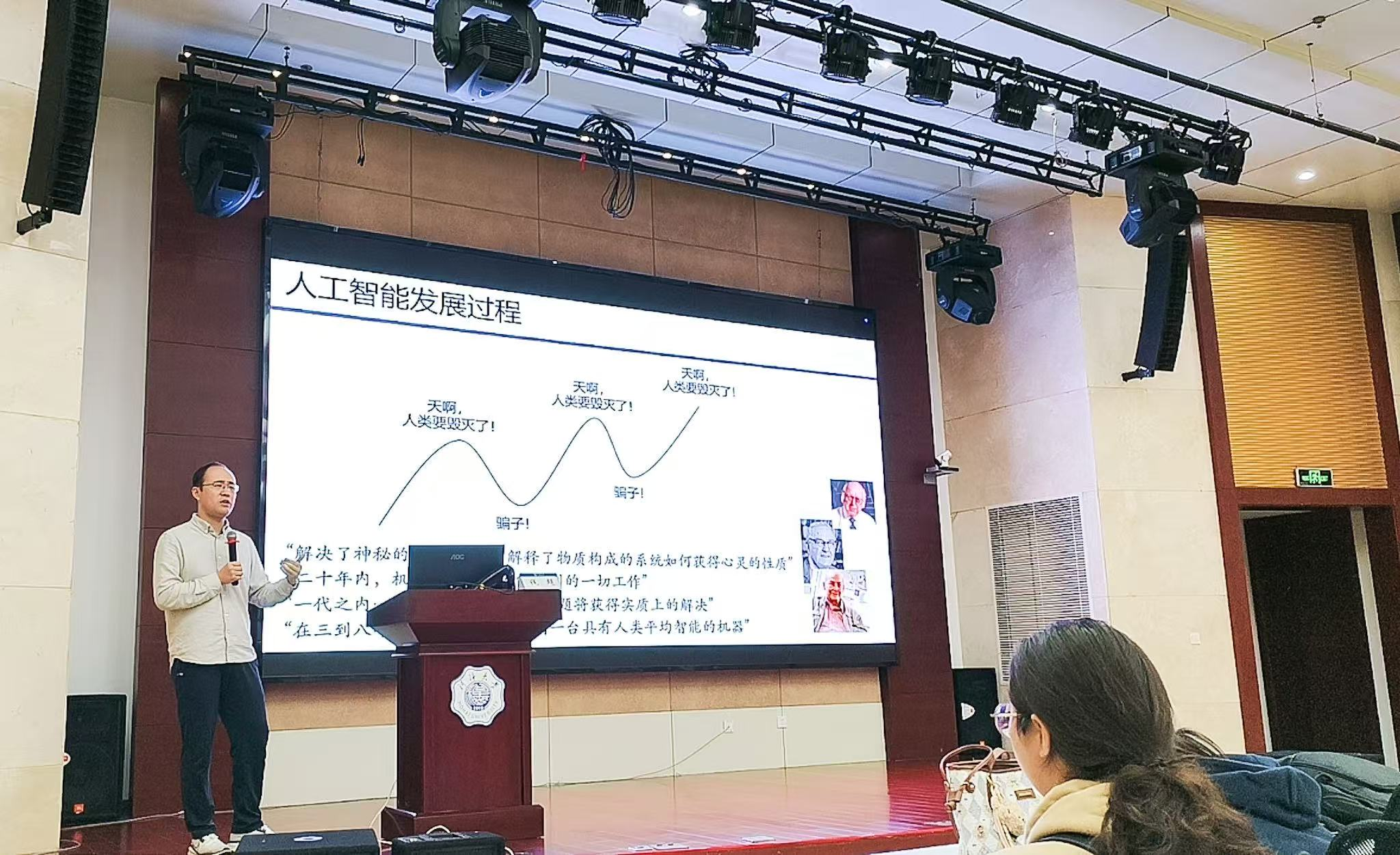 本次报告会系统而全面地介绍了人工智能这一改变世界的前沿技术。钱教授首先回顾了人工智能从诞生至今的发展历程,梳理了从早期符号主义、专家系统,到机器学习、深度学习,再到当前大模型时代的关键里程碑事件和技术突破,帮助同学们理解人工智能技术演进的内在逻辑与发展脉络。