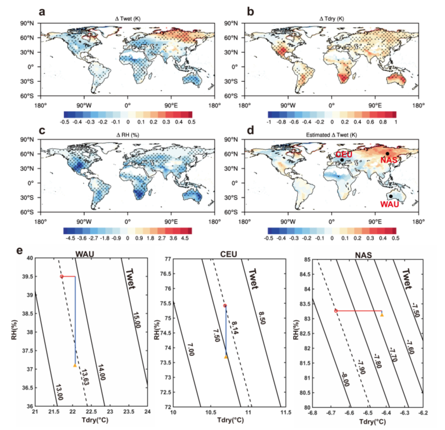 受气候变暖影响,极端天气事件日趋频发。其中,高温与高湿并存的湿热浪事件正对全球多个地区构成严峻挑战。这种温湿协同升高的组合会显著削弱人体体温调节能力,大幅增加户外工作者罹患热病乃至死亡的风险,对人类健康的威胁远超仅以高温异常为特征的干热浪。尽管科学界已经逐步认识到陆气相互作用在调节极端高温过程的关键作用,但湿热浪所受关注仍明显不足。针对上述不足,我校袁山水教授团队与南京信息工程大学、加州大学洛杉矶分校合作,开展了有无陆气耦合情景的气候对比实验以及偏微分方程分析,揭示了土壤湿度-大气反馈对干、湿热浪的差异化影响机制,并从“增温”与“减湿”相互竞争的角度阐明了全球湿热浪响应的区域化差异(图1)。